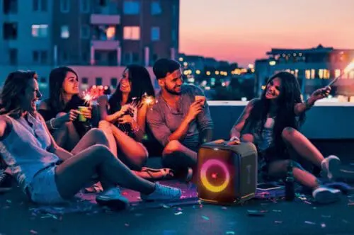 اسپیکر بلوتوثی قابل حمل جی بی ال مدل Partybox Encore Essential اورجینال پلمپ به همراه دو عدد میکروفن