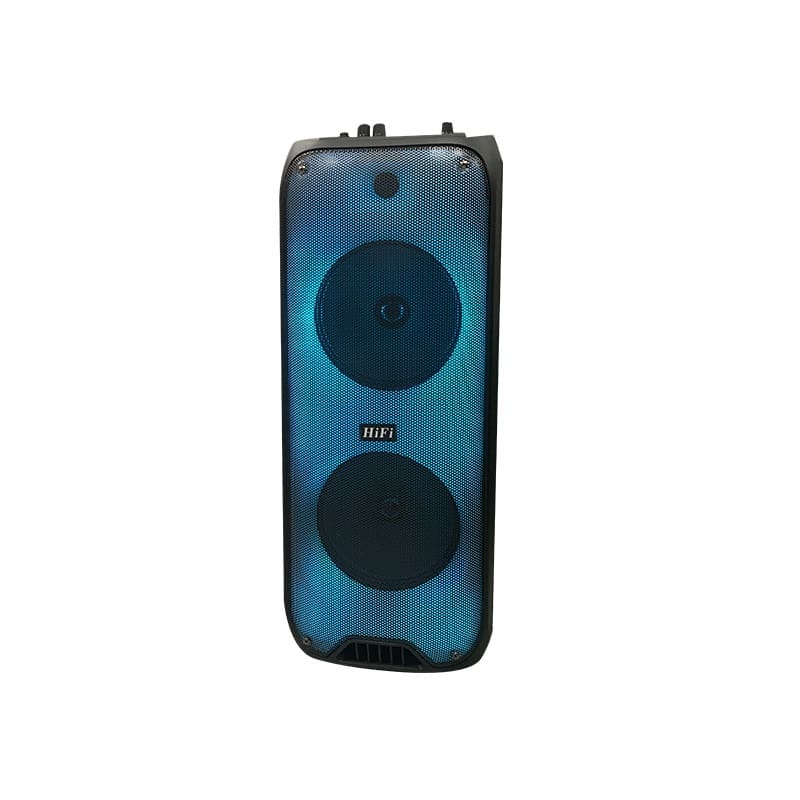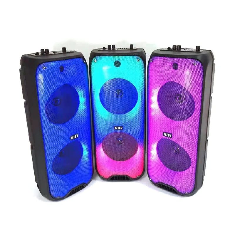 26.5*25.5*65.5Cm و با بلوتوث به میتوانید به ان متصل شوید.علاوه بر ان امکان اتصال از طریق AUX, usb نیز اتصال برقرار میشود.بدنه این اسپیکر از پلاستیک مقاوم بوده که در برابر اسیب و ضربه مقاومت بالایی دارد.همچنین دارای نور های RGB LED زیبایی بوده که جذابیت این اسپیکر را دو چندان کرده است.باتری 3000 میلی آمپر ساعت این دستگاه به شما این اجازه را میدهد تا برای3 الی 5 ساعت از آن استفاده کنید و موزیک گوش دهید.همچنین دارای موج FM بوده که میتوانید به رادیو گوش دهید.این اسپیکر همراه با یک عدد میکروفون نیز میباشد.زمان تایم شارژ این دستگاه 2 ساعت میباشد.