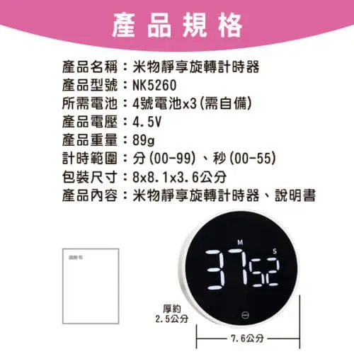 جنس بدنه این تایمر ABS بوده و ابعاد آن برابر با 78*78 میلی متر می باشد. قسمت پایینی آن دارای آهنربا است که با چسباندن تایمر به مکان های فلزی به راحتی قابل استفاده است. مکان هایی مانند بدنه فلزی یخچال، مایکروفر و … برای اتصال این ساعت بسیار مناسب هستند.