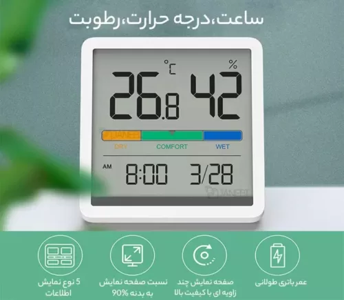 این محصول نیز مانند دیگر محصولات شیائومی از طراحی زیبا و مینیمال برخوردار است. صفحه نمایش بزرگ HD و سنسور دما و رطوبت با دقت بالا از ویژگی های این محصول است. البته این دستگاه نه تنها دما و رطوبت را اندازه گیری می کند، بلکه زمان، تاریخ و سطح راحتی را نیز نمایش می دهد.