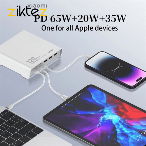 هاب شارژر LDNIO Q605 با حداکثر توان خروجی 120 وات و داشتن 6 پورت خروجی متشکل از 3 عدد USB و 3 پورت Type-c میتواند انتخاب خوبی برای میز کارتان باشد. به کمک این تعداد پورت میتوانید همزمان چند وسیله مدنظر خود را شارژ کنید. هاب شارژر الدینیو Q605 دارای چندین پروتکل شارژ سریع از جمله PD3.0-QC3.0-AFC-FCP- SCP-PPS است. از جمله با این شارژر میتوانید گوشیهای آیفون 14 و 15 و گوشیهای جدید ساموسنگ را با بالاترین شارژ ممکن شارژ کنید. از پورت Type-cشماره 1 این هاب شارژربه دلیل توان 65 واتی برای شارژ لپ تاپ خود نیز میتوانید استفاده کنید.مشخصات درگاههای هاب شارژر LDNIO Q605