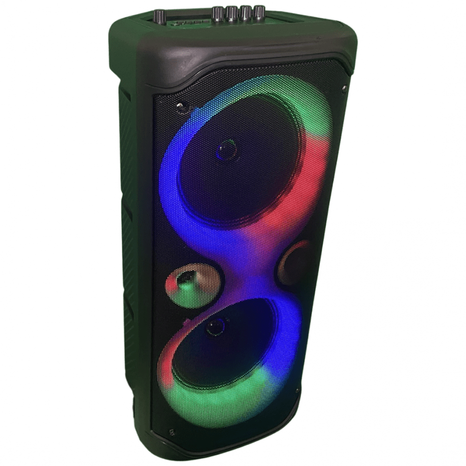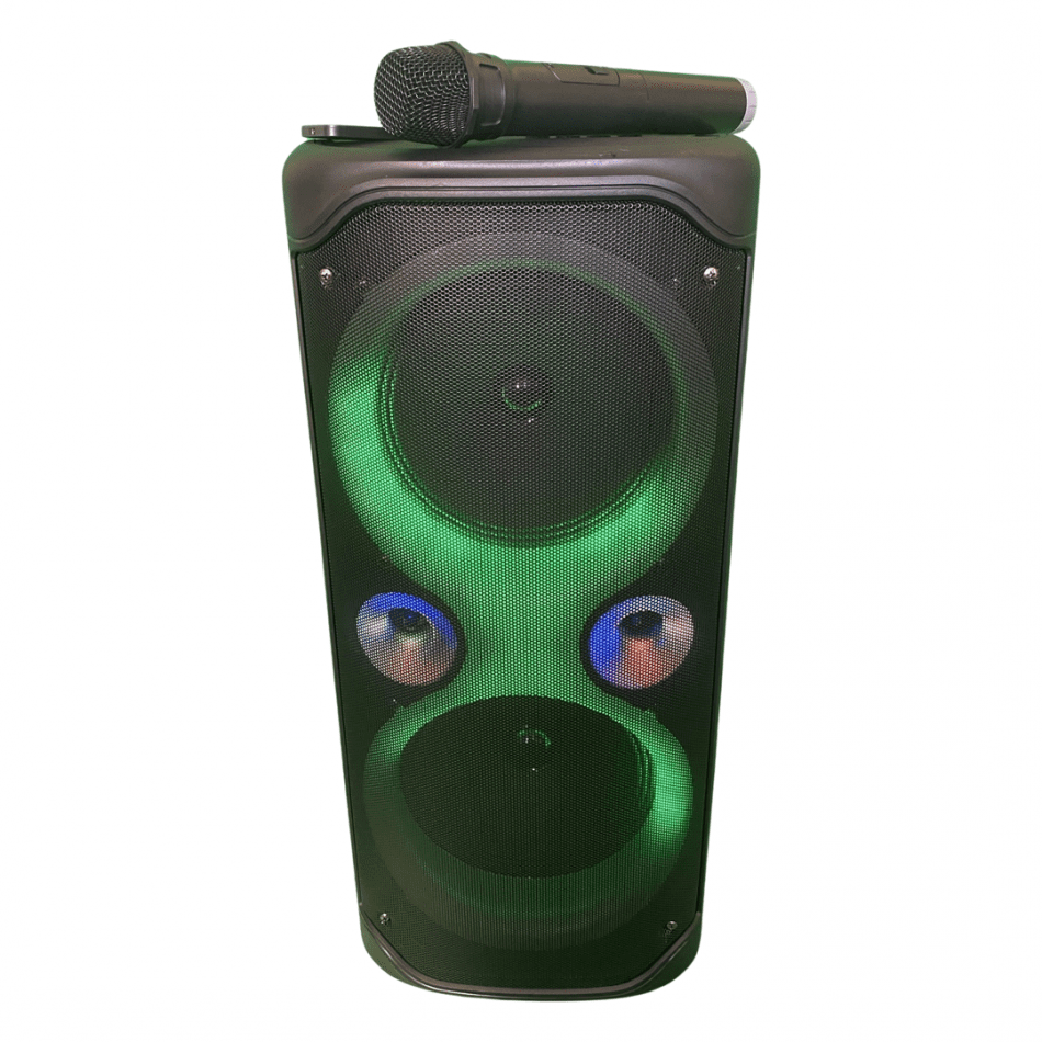 26.5*25.5*65.5Cm و با بلوتوث به میتوانید به ان متصل شوید.علاوه بر ان امکان اتصال از طریق AUX, usb نیز اتصال برقرار میشود.بدنه این اسپیکر از پلاستیک مقاوم بوده که در برابر اسیب و ضربه مقاومت بالایی دارد.همچنین دارای نور های RGB LED زیبایی بوده که جذابیت این اسپیکر را دو چندان کرده است.باتری 3000 میلی آمپر ساعت این دستگاه به شما این اجازه را میدهد تا برای3 الی 5 ساعت از آن استفاده کنید و موزیک گوش دهید.همچنین دارای موج FM بوده که میتوانید به رادیو گوش دهید.این اسپیکر همراه با یک عدد میکروفون نیز میباشد.زمان تایم شارژ این دستگاه 2 ساعت میباشد.